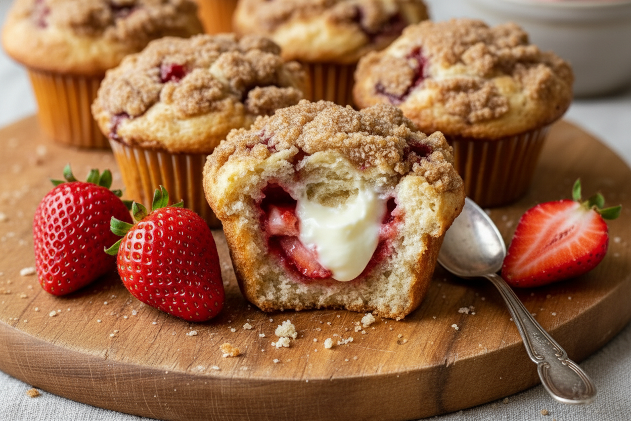 Delicious, bakery-style muffins bursting with fresh strawberries, a sweet cream cheese filling, and a buttery crumb topping.