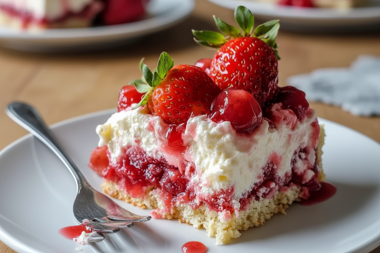 A luscious and easy dessert featuring a moist strawberry cake base topped with a creamy cheesecake layer, fresh strawberries, and melty white chocolate chips.