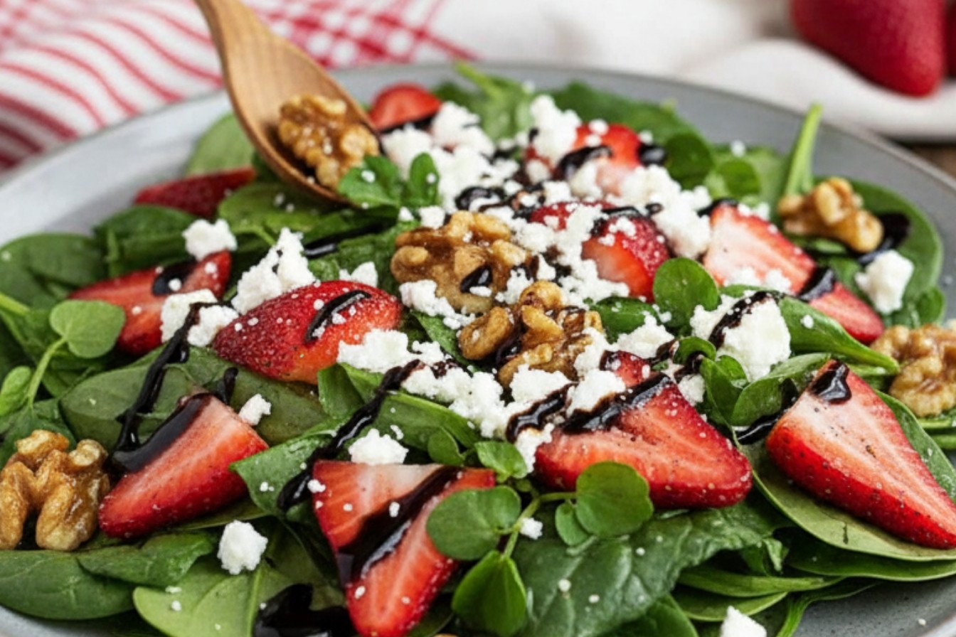 A vibrant and delicious salad featuring sweet strawberries, fresh spinach, creamy goat cheese, and maple-glazed walnuts, all tossed in a light maple vinaigrette.