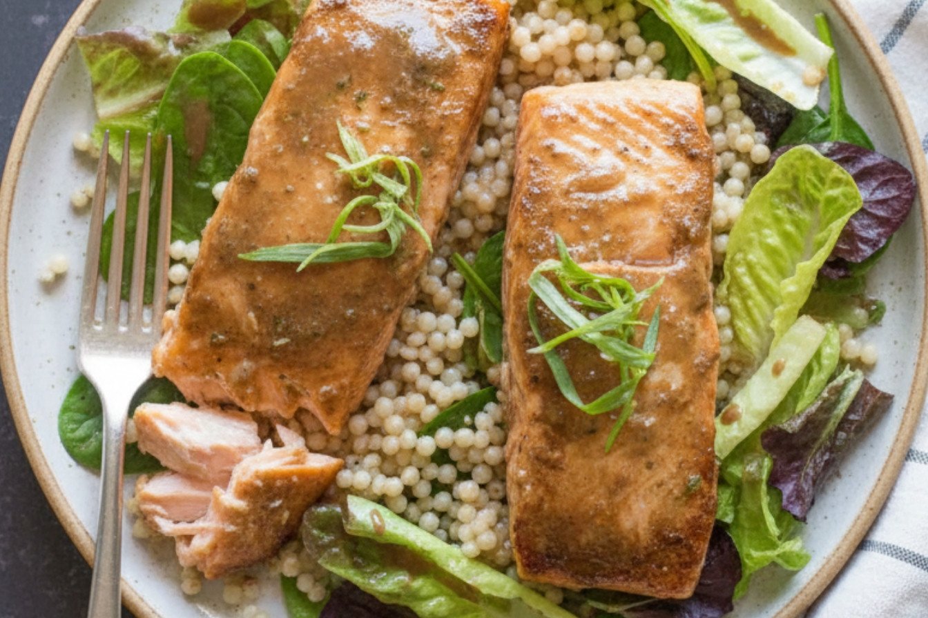Honey Mustard Balsamic Roasted Salmon with a fresh couscous salad. A perfect blend of sweet, tangy, and savory flavors for a healthy and satisfying meal.