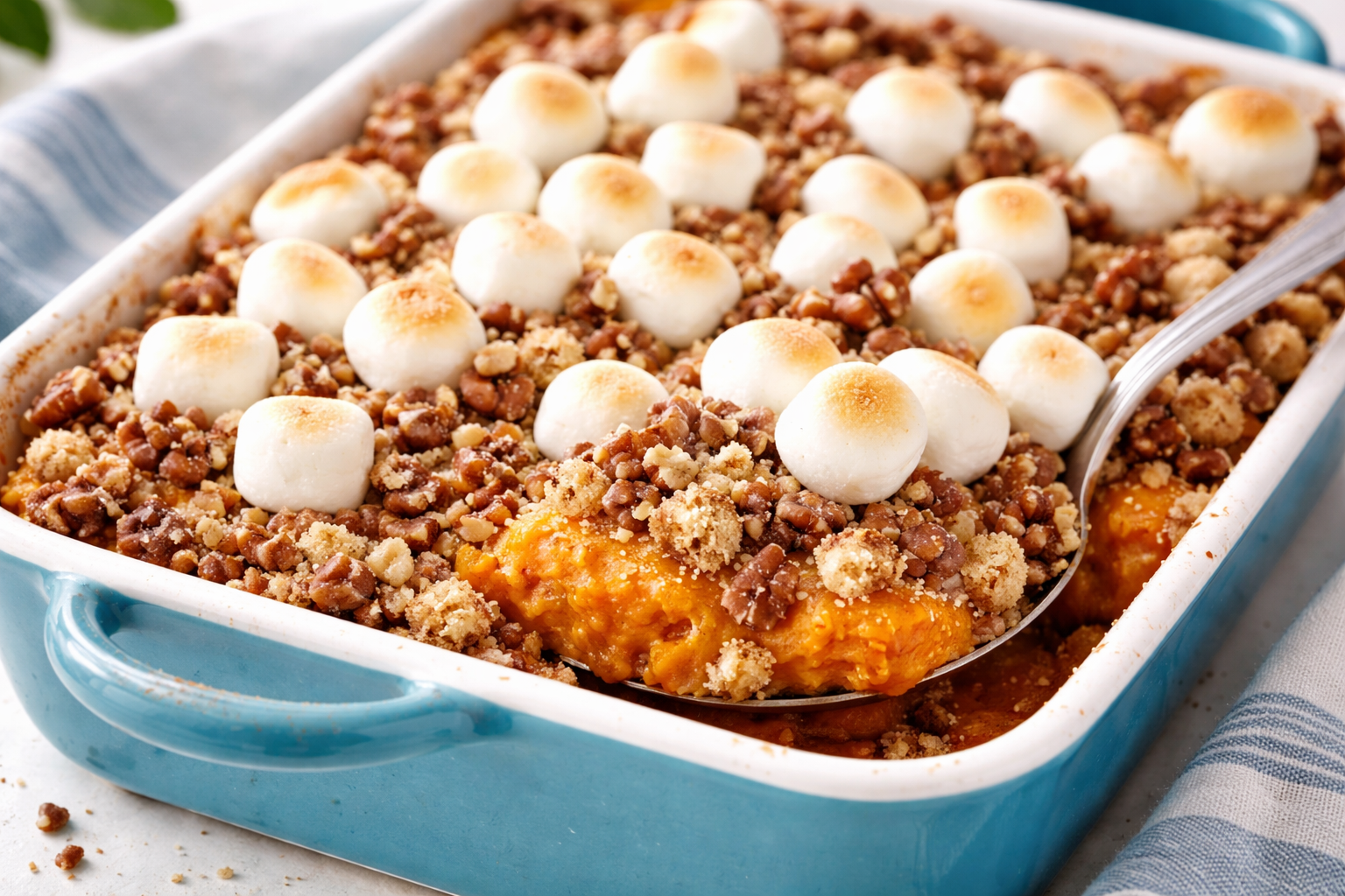 This casserole is a crowd-pleaser, perfect for holidays or cozy nights. I love how the marshmallows puff into golden clouds. *Fun fact: My grandkids call it “dessert for dinner.”*