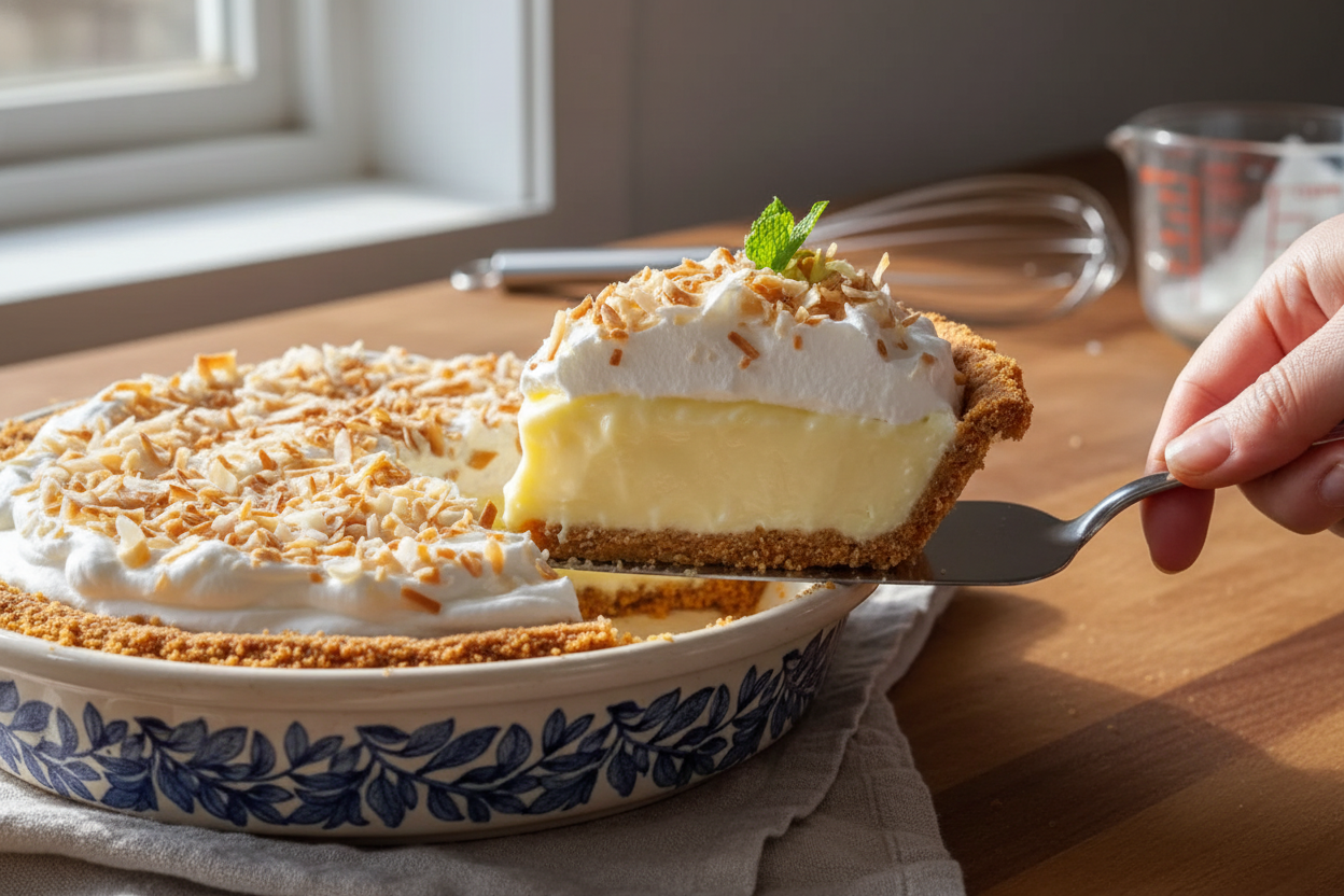 Spread sweetened coconut flakes on a baking sheet. Bake at 350°F for just 5-8 minutes. Watch it closely. Stir it once or twice. It turns golden brown very fast. A fun fact: toasting brings out the coconut’s natural oils and sweetness. Let it cool before sprinkling on your pie for a crunchy, flavorful finish.
