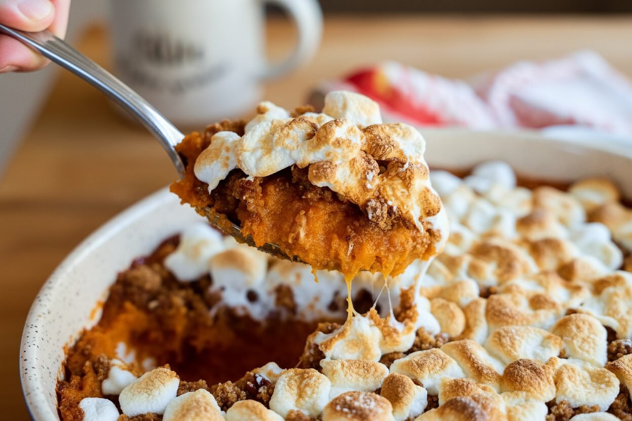 Keywords:Sweet Potato Casserole, Holiday Side Dish, Pecan Topping, Marshmallows