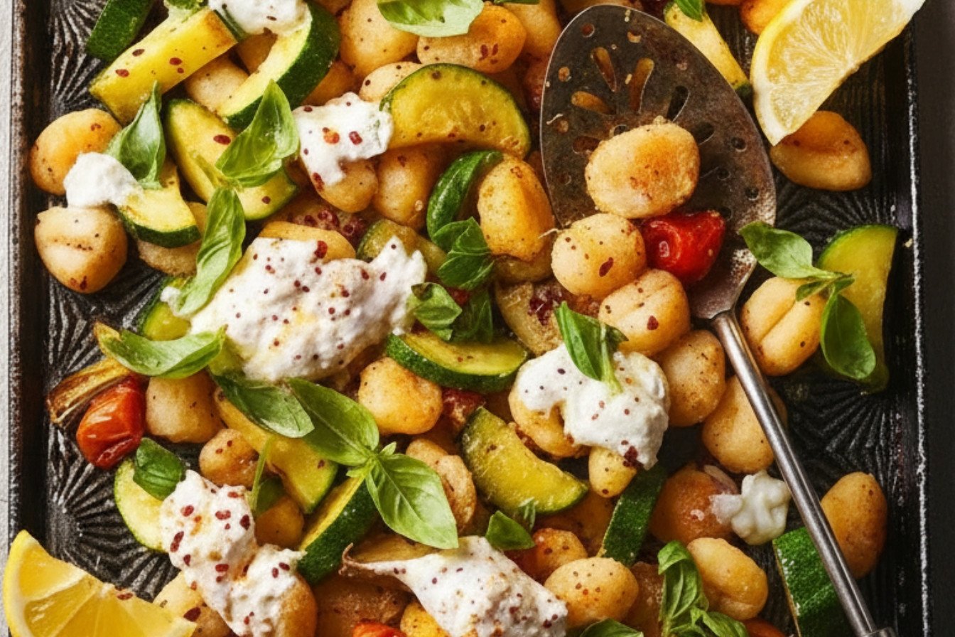 Step 3: Roast it all for 20 minutes. You’ll know it’s ready when the gnocchi is golden. Doesn’t that smell amazing? While it bakes, mix ricotta with lemon zest. Stir in most of your fresh basil. This makes a cool, creamy cloud for your hot traybake.