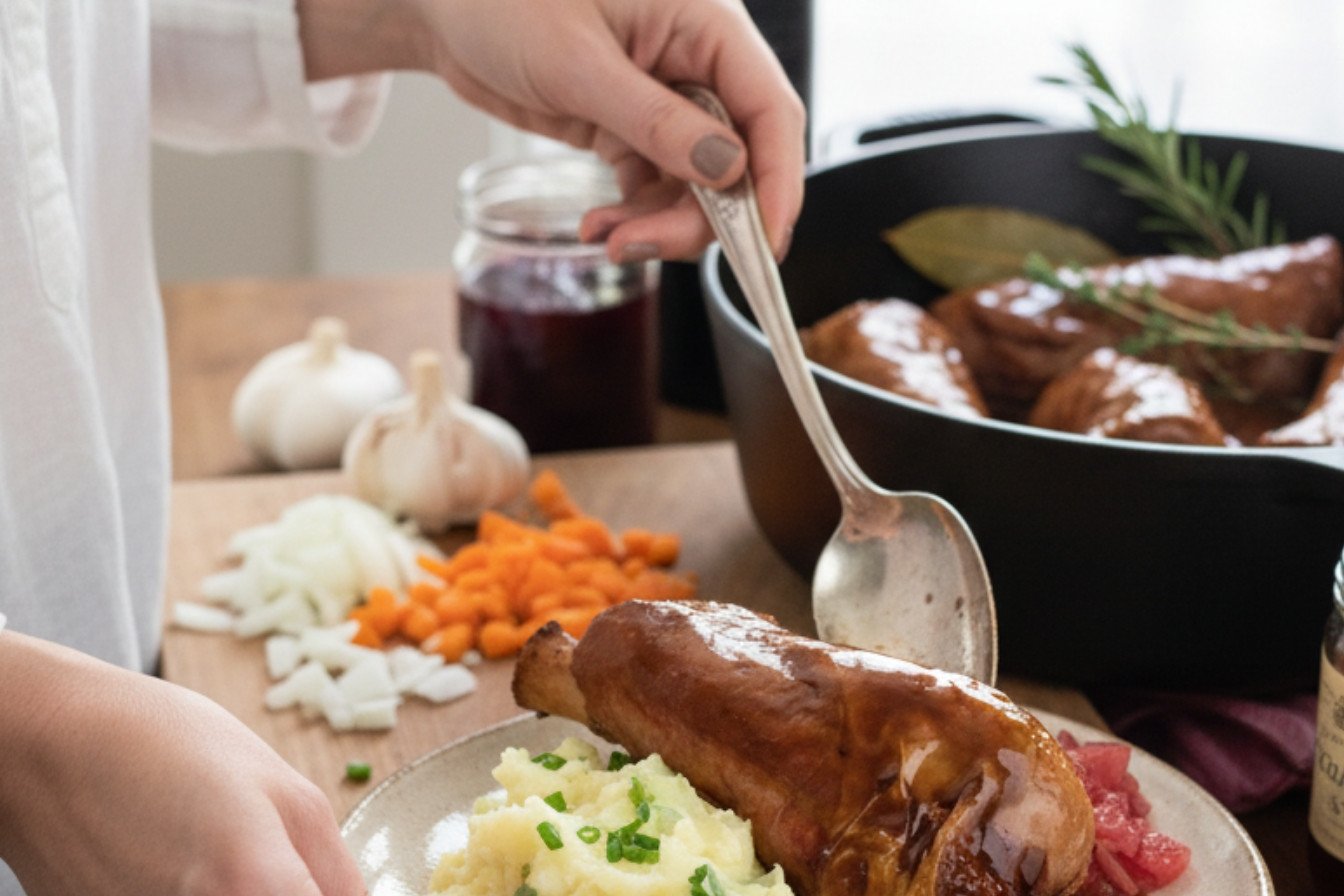 After hours of gentle cooking, the feast is ready. You spoon the glossy sauce over the meat. The champ sits there, waiting. This is more than food. It is a feeling of home and care.