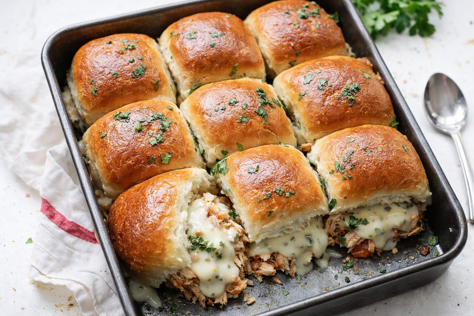 Q: Can I make these gluten-free? A: Yes! Use gluten-free rolls and check labels on sauces and cheeses. Q: How far ahead can I assemble these? A: Prep them 1 day ahead—just add the butter topping right before baking. Q: Any swaps for sun-dried tomatoes? A: Try roasted red peppers or skip them for a milder taste. Q: Can I use chicken breasts? A: Sure! Cook and shred 2 large breasts (about 3 cups). Q: How do I halve the recipe? A: Use a 9×5-inch pan and bake for 12–15 minutes.Let’s Share the Love