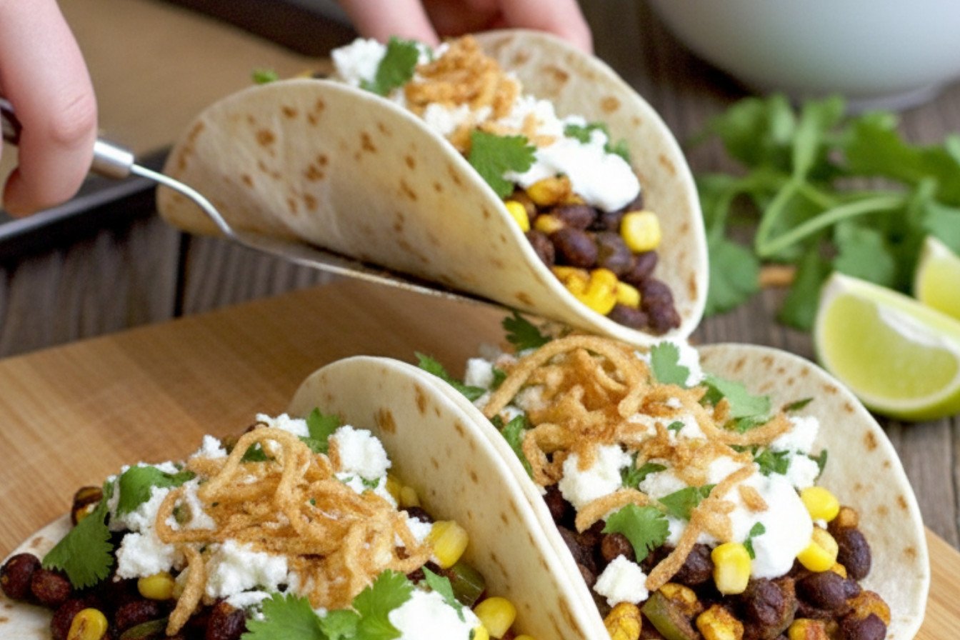 Do not skip the toppings! They are what make the taco special. The cool cilantro crema balances the warm beans. The crispy onions add a fun crunch. A squeeze of fresh lime juice at the end is key.